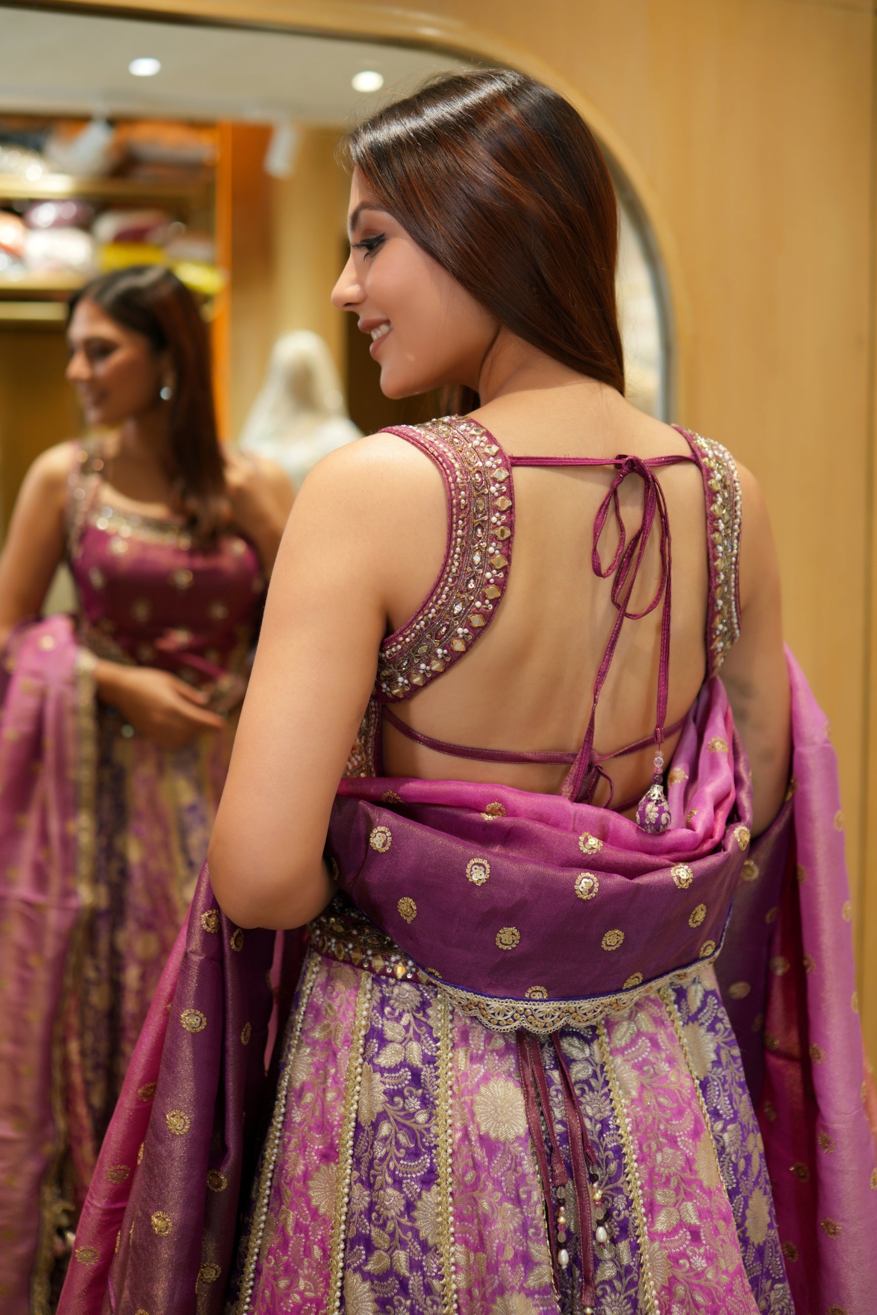 Introducing beautiful pink & purple kali lehenga in banarasi silk fabric from Indrani store. It is accentuated with exquisite embroidery like sequins, mirror & aari. It comes with a corset embroidered blouse and a shimmer tissue dupatta.