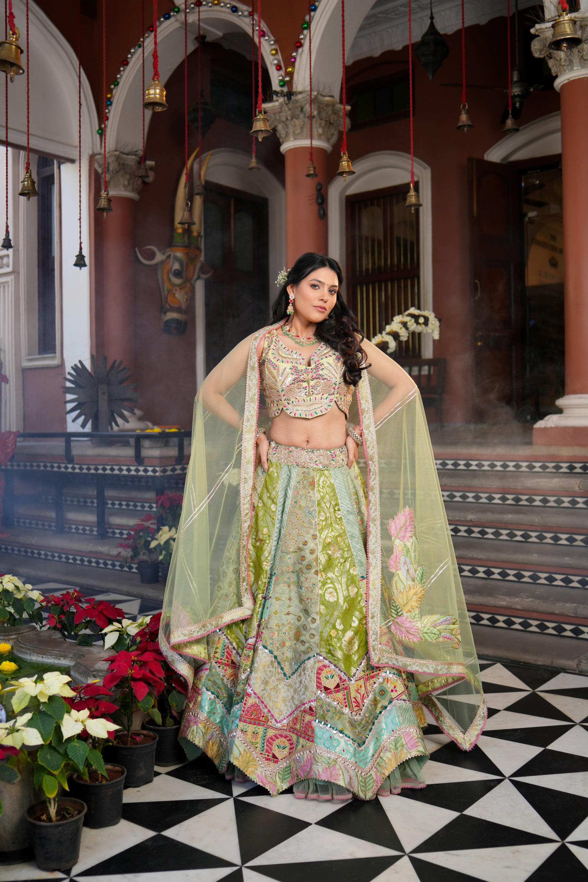 Introducing this vibrant pista green multi kali lehenga in banarasi fabric from Indrani store. The lehenga has beautiful patch work all over with fancy cut border. the ensemble is complement with matching blouse and dupatta.