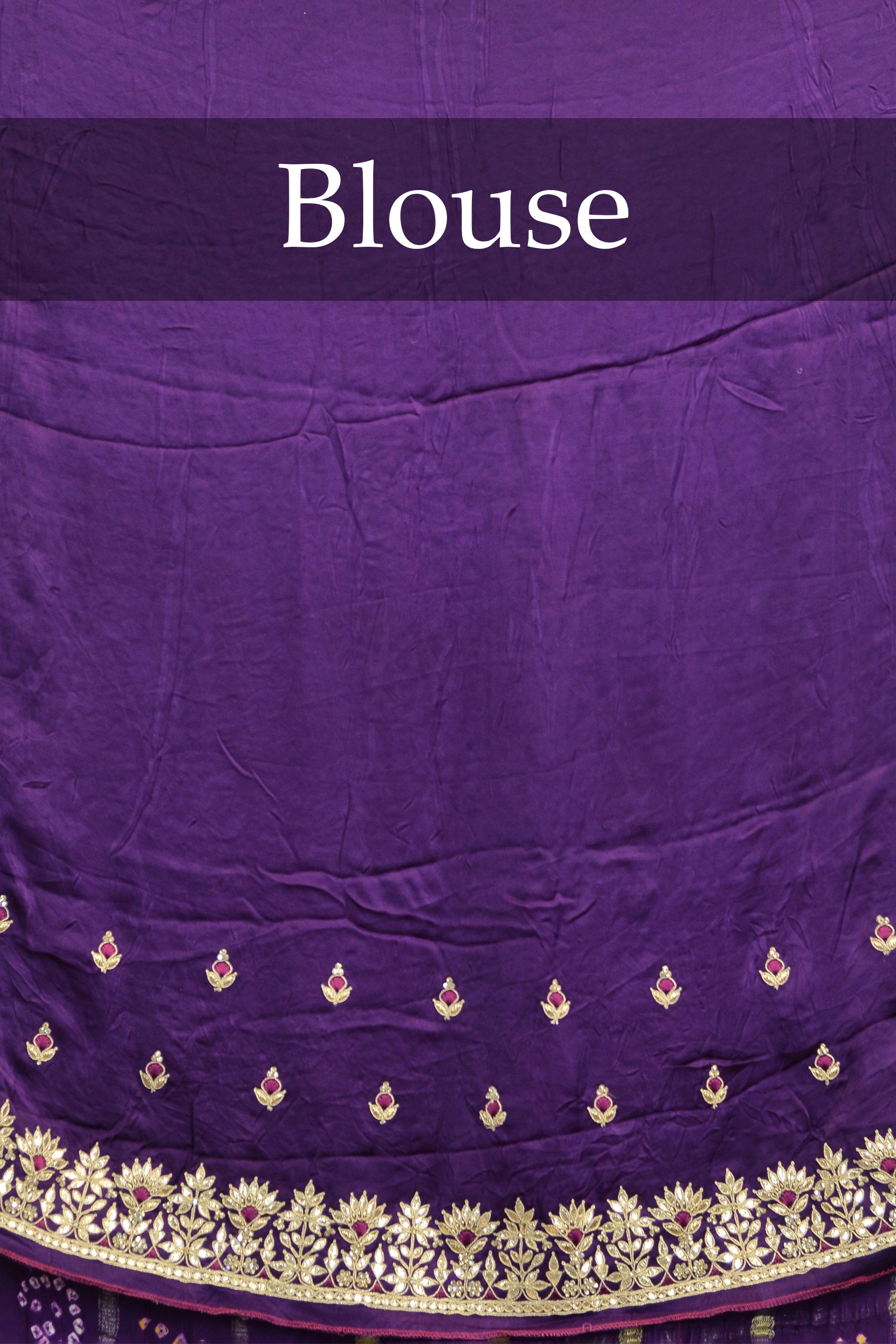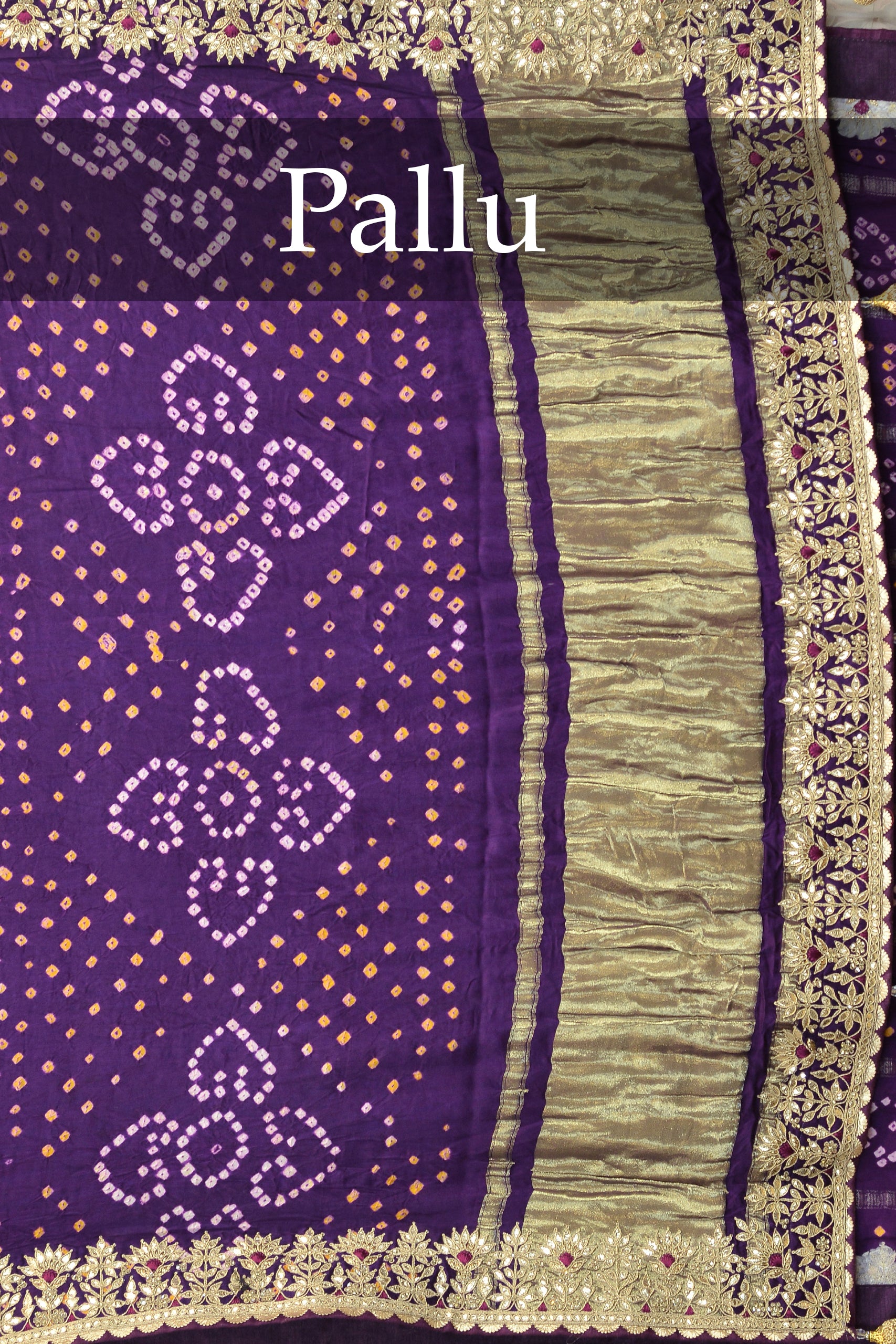 Featuring a lovely purple gaji silk bandhani gharchola saree from Indrani saree. The saree is adorned with intricate gota patti handwork which makes it all the more a perfect choice for occasion wear. It comes with matching bandhej blouse.