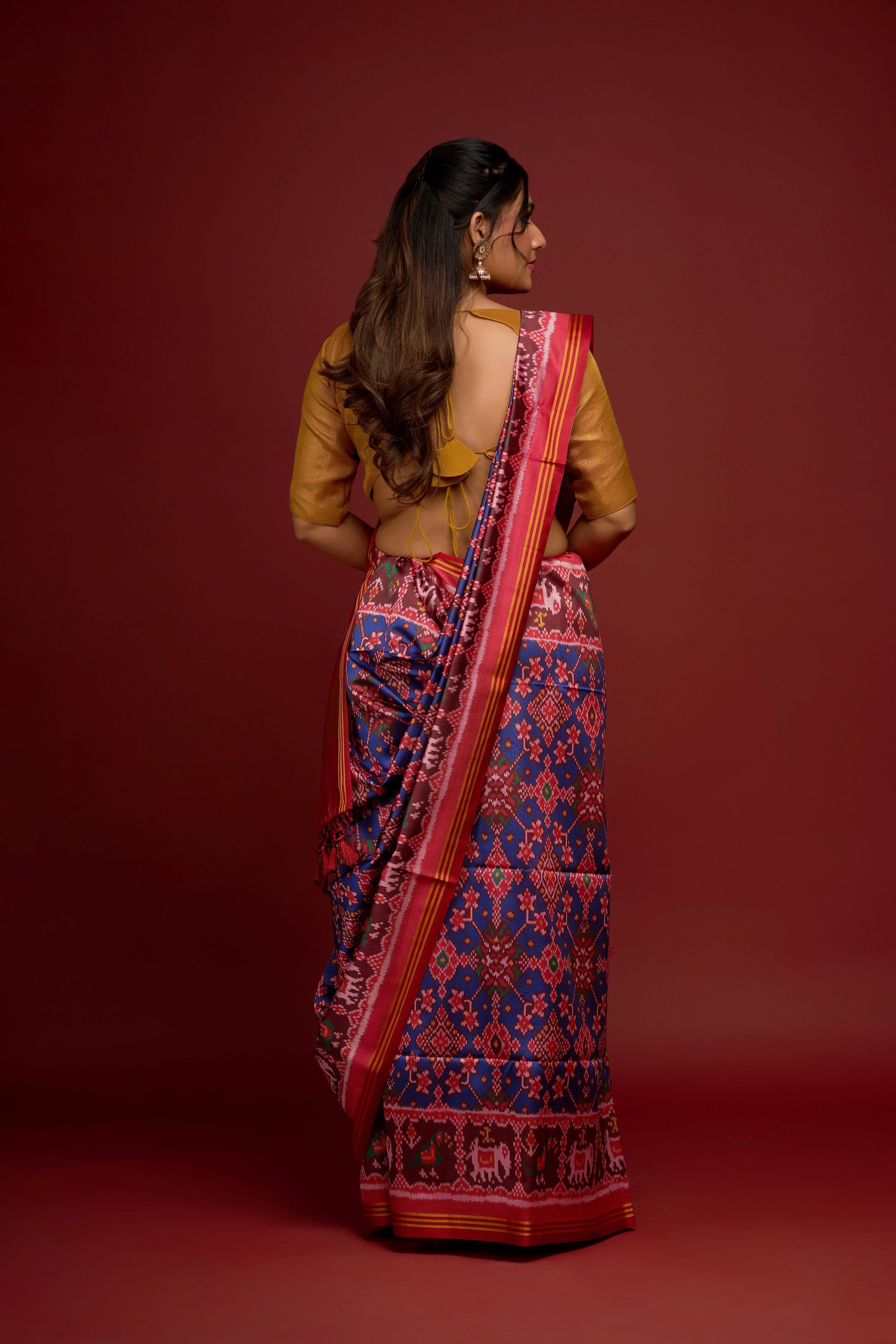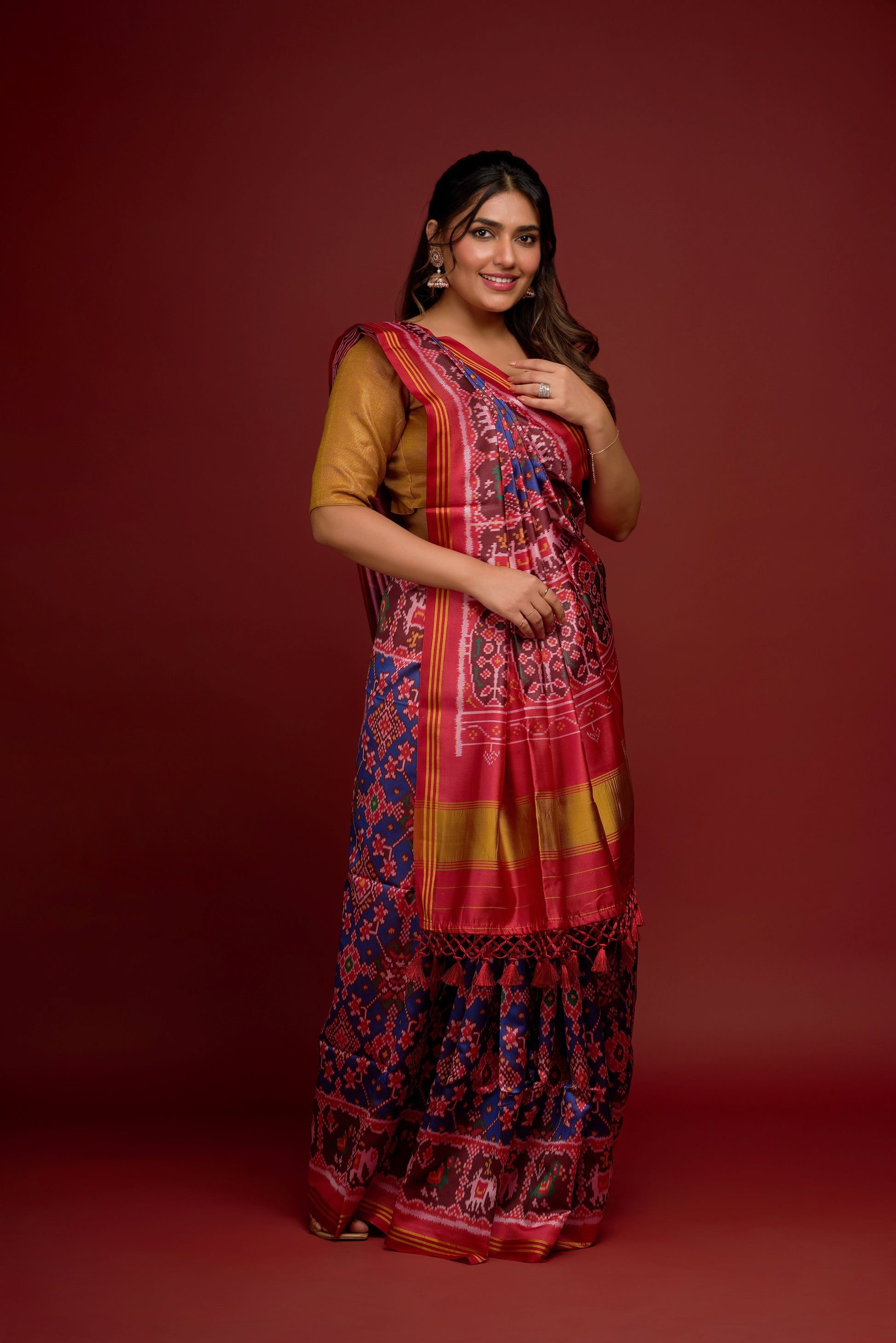 Featuring this chic yet elegant stunning red and blue semi patola saree from Indrani store. This saree has tassels detailing on the pallu making it more appealing. It comes with a matching silk red blouse material.