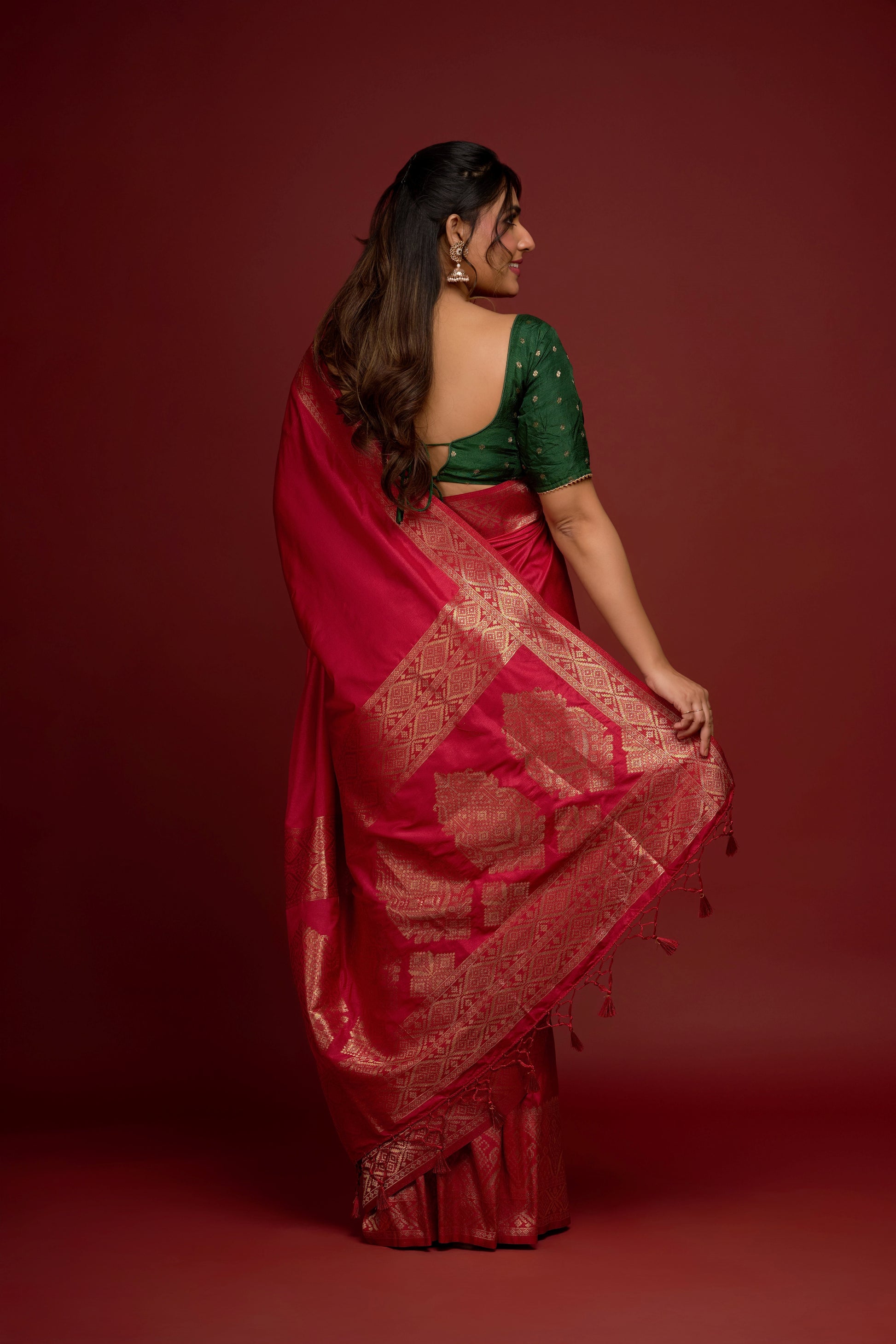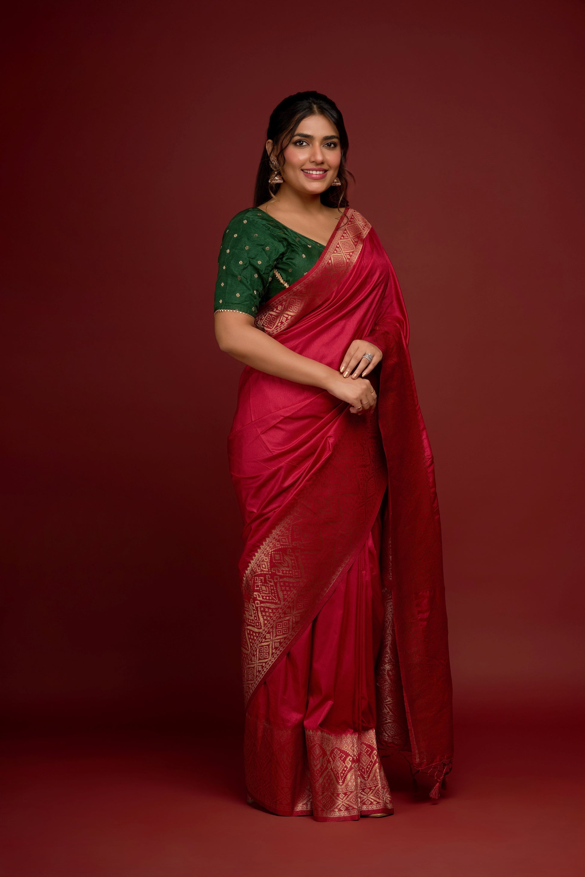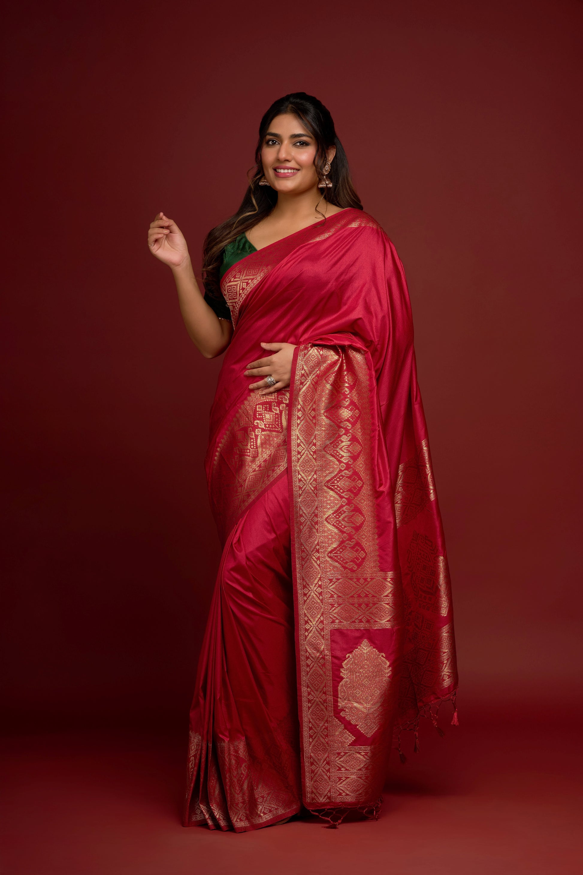 Featuring this stunning bright red dola silk saree from Indrani store. This saree has a golden border all over and tassels detailing on the pallu making it more elegant yet subtle. To accentuate the look the saree comes with matching dola silk blouse material.
