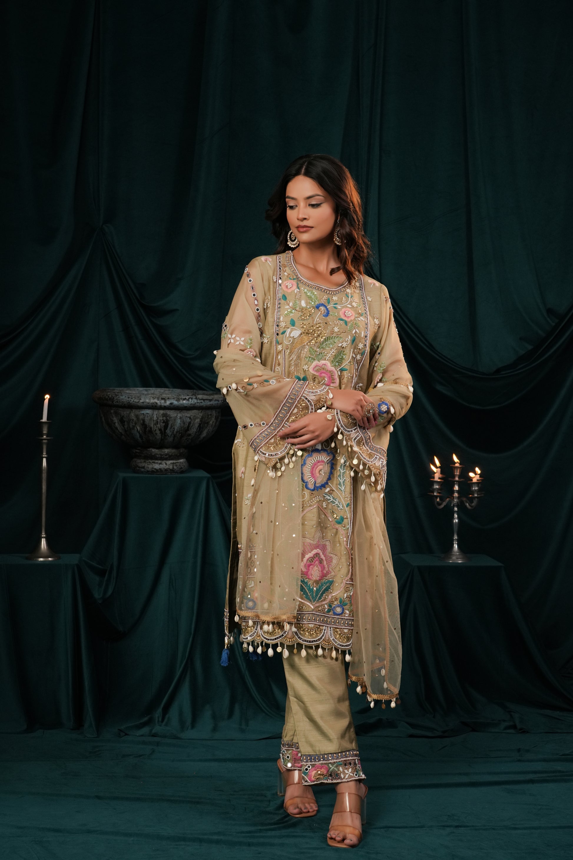 Elevate your fashion with this elegant sage green suit set in silk fabric from Indrani store. The set is heavily embedded with heavy mixed embroidery all over. The rich hue and classic silhouette offer a graceful look, making it perfect for festive occasions. The set is paired with lightly embroidered net dupatta.