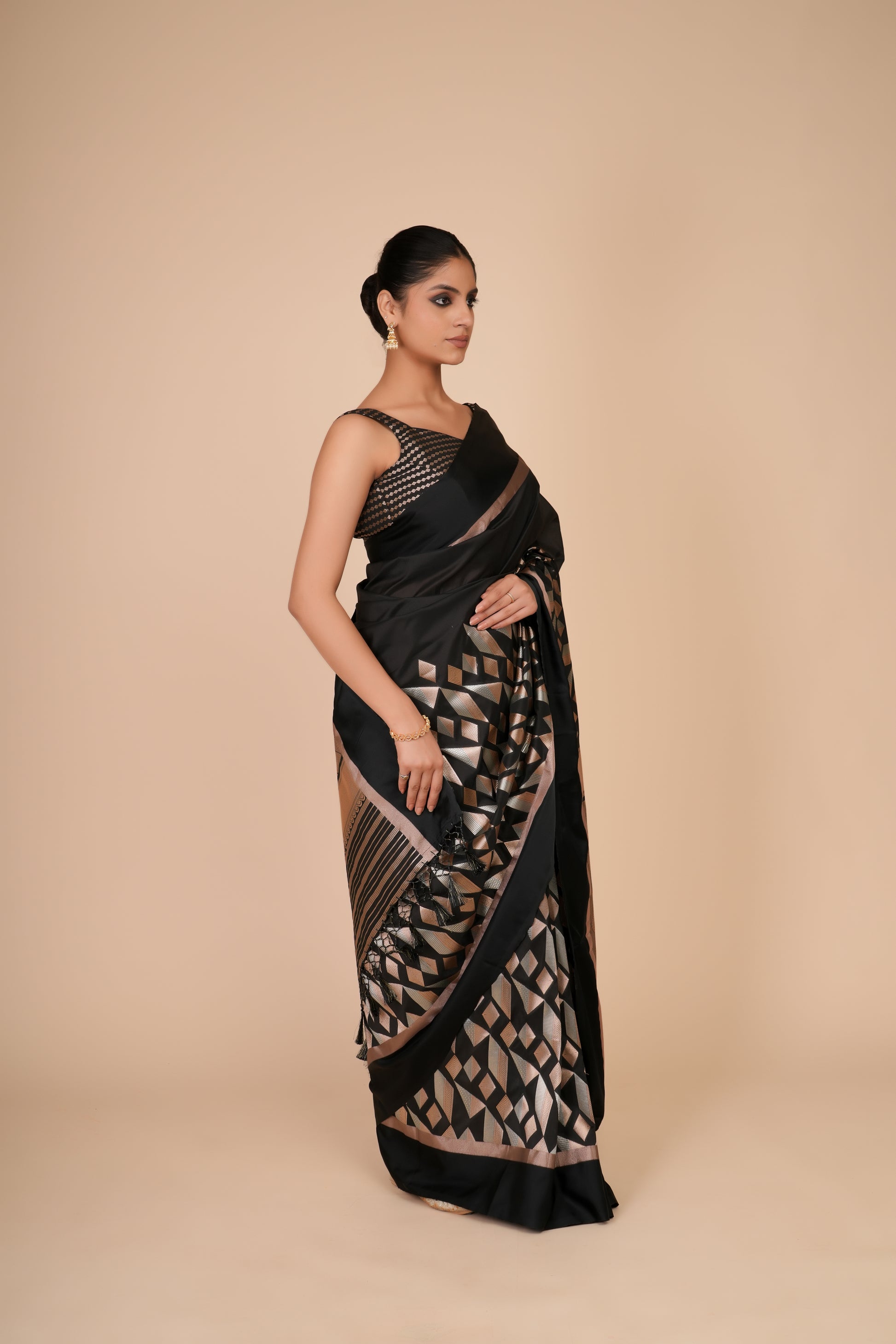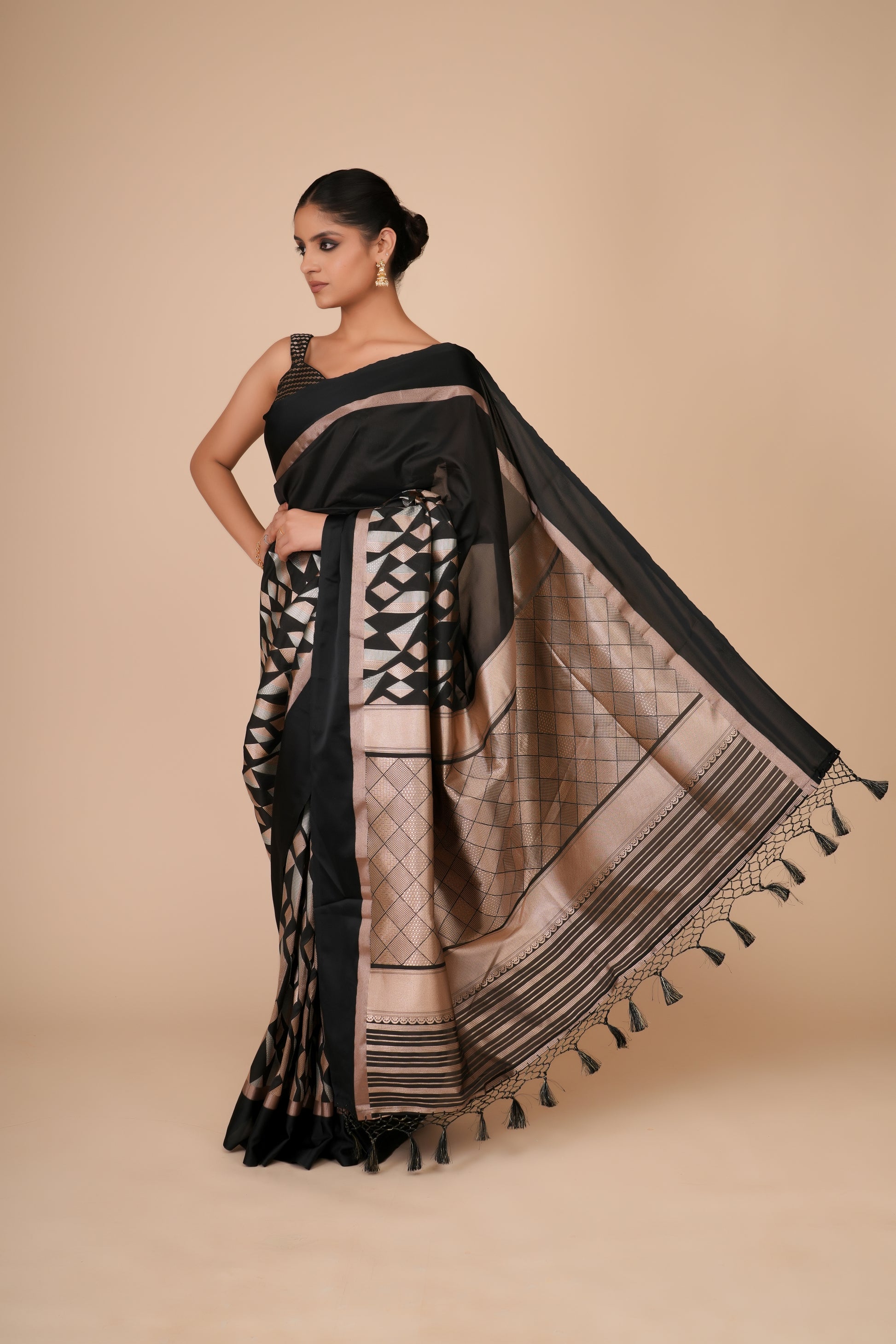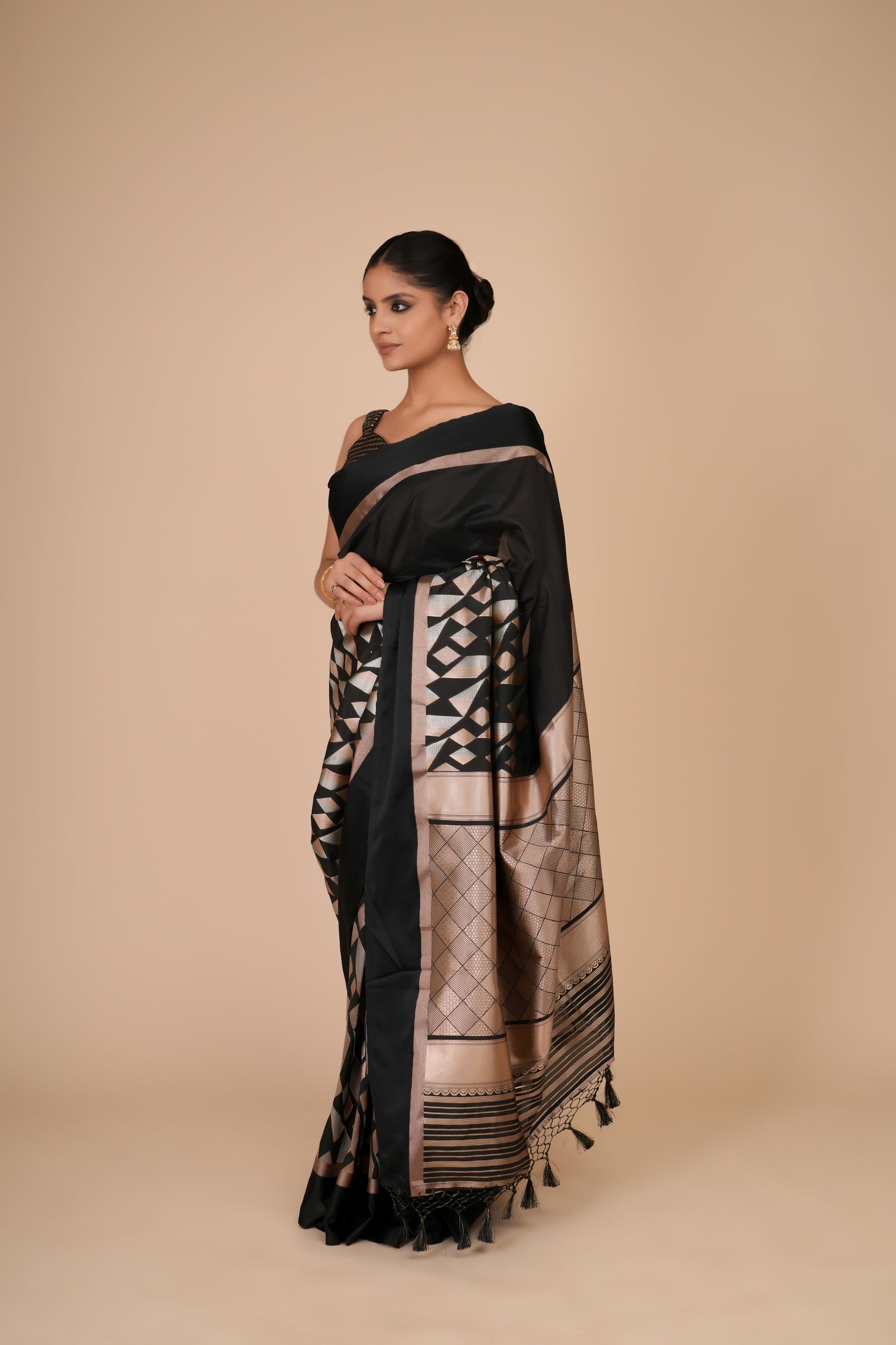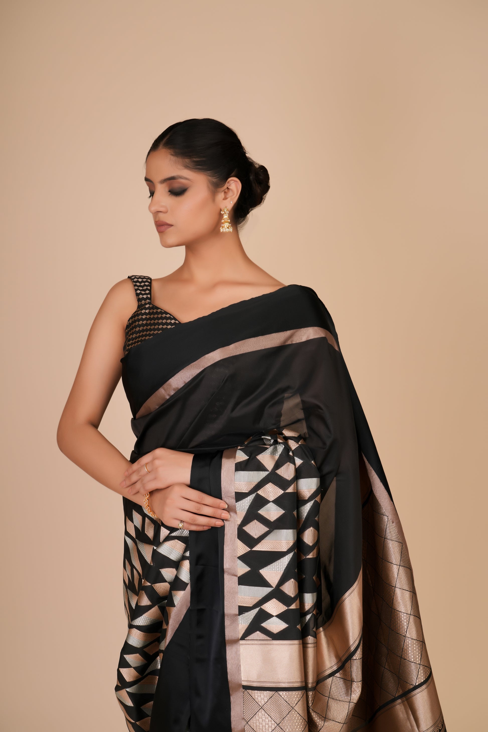 Featuring this classic black saree in Banarasi silk fabric from Indrani store. This saree has beautiful geometric pattern all over in silver and golden color. The saree comes with a heavy pallu and a matching blouse.