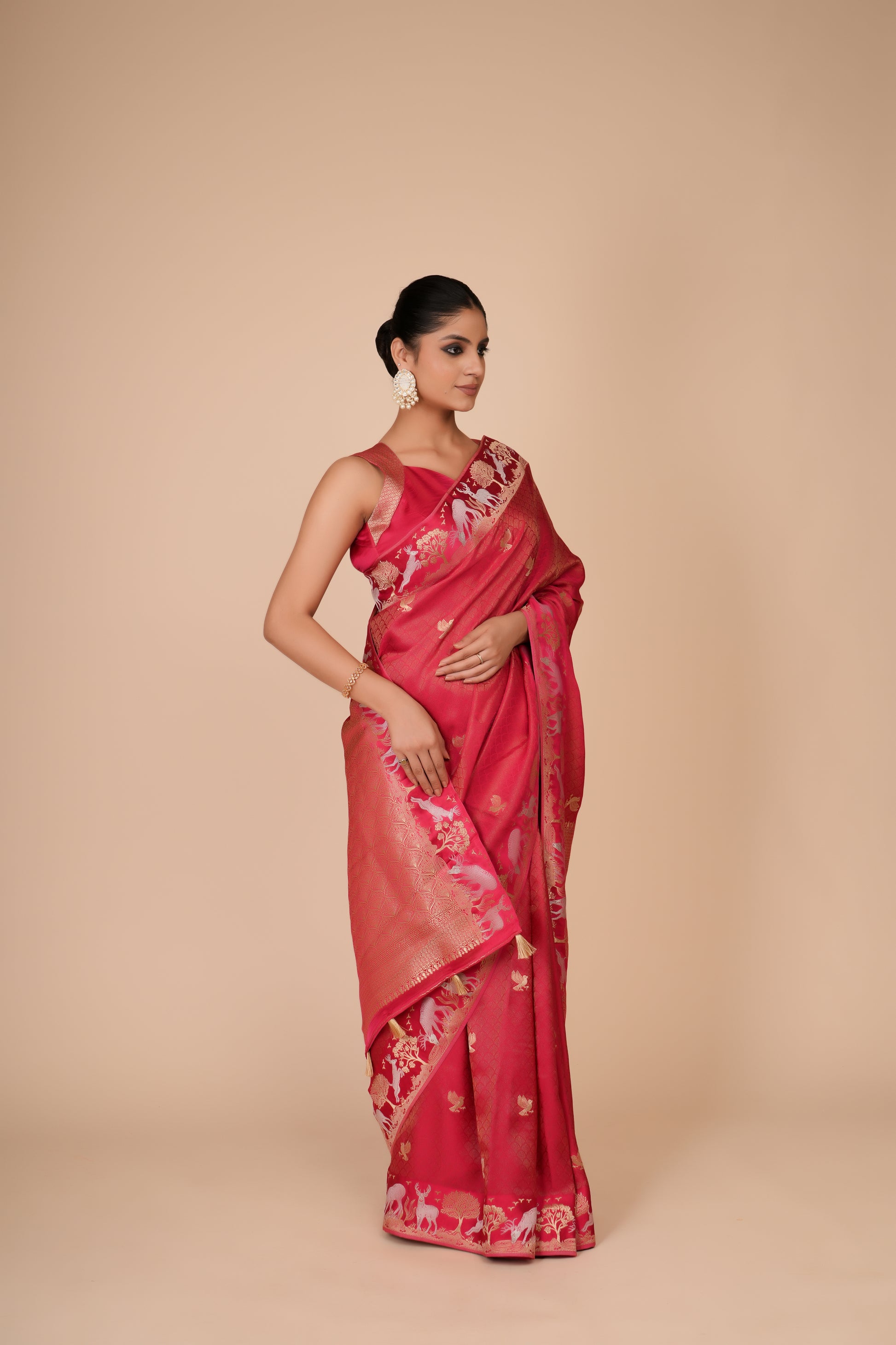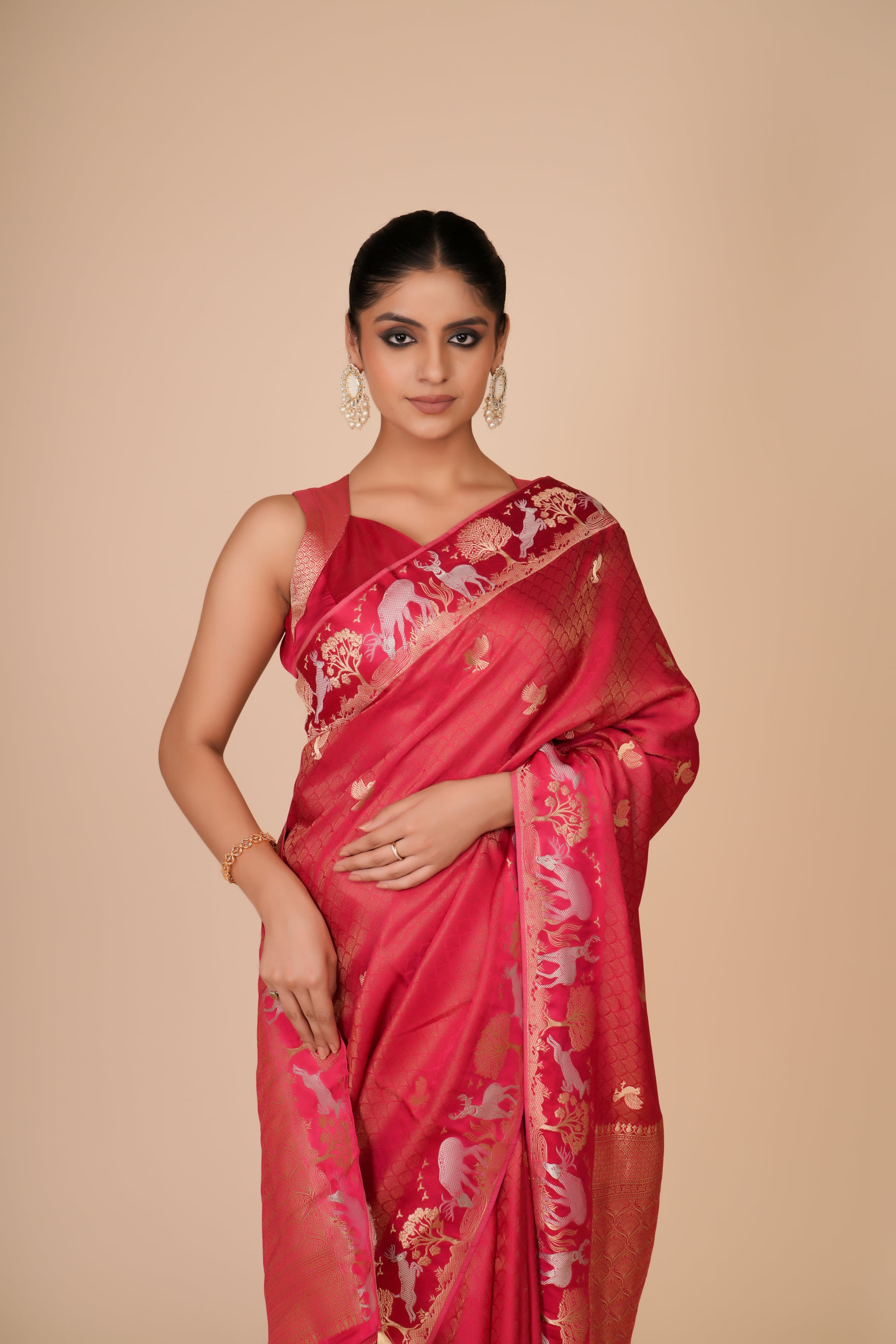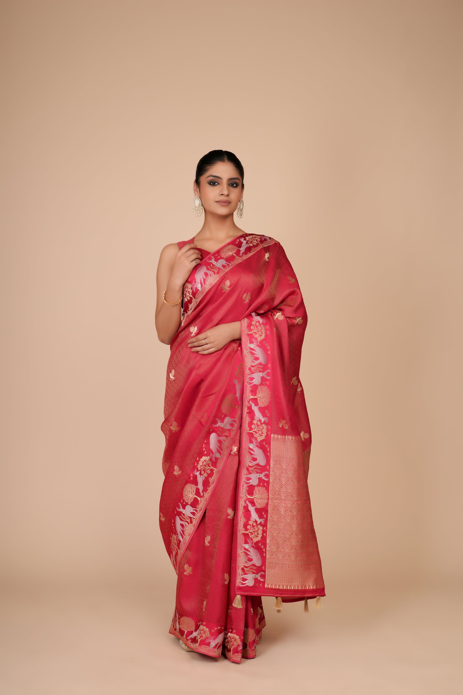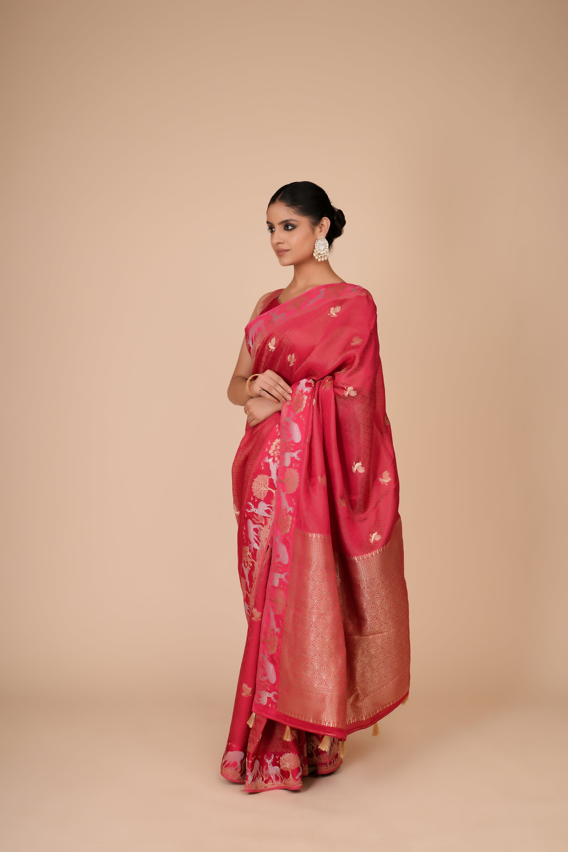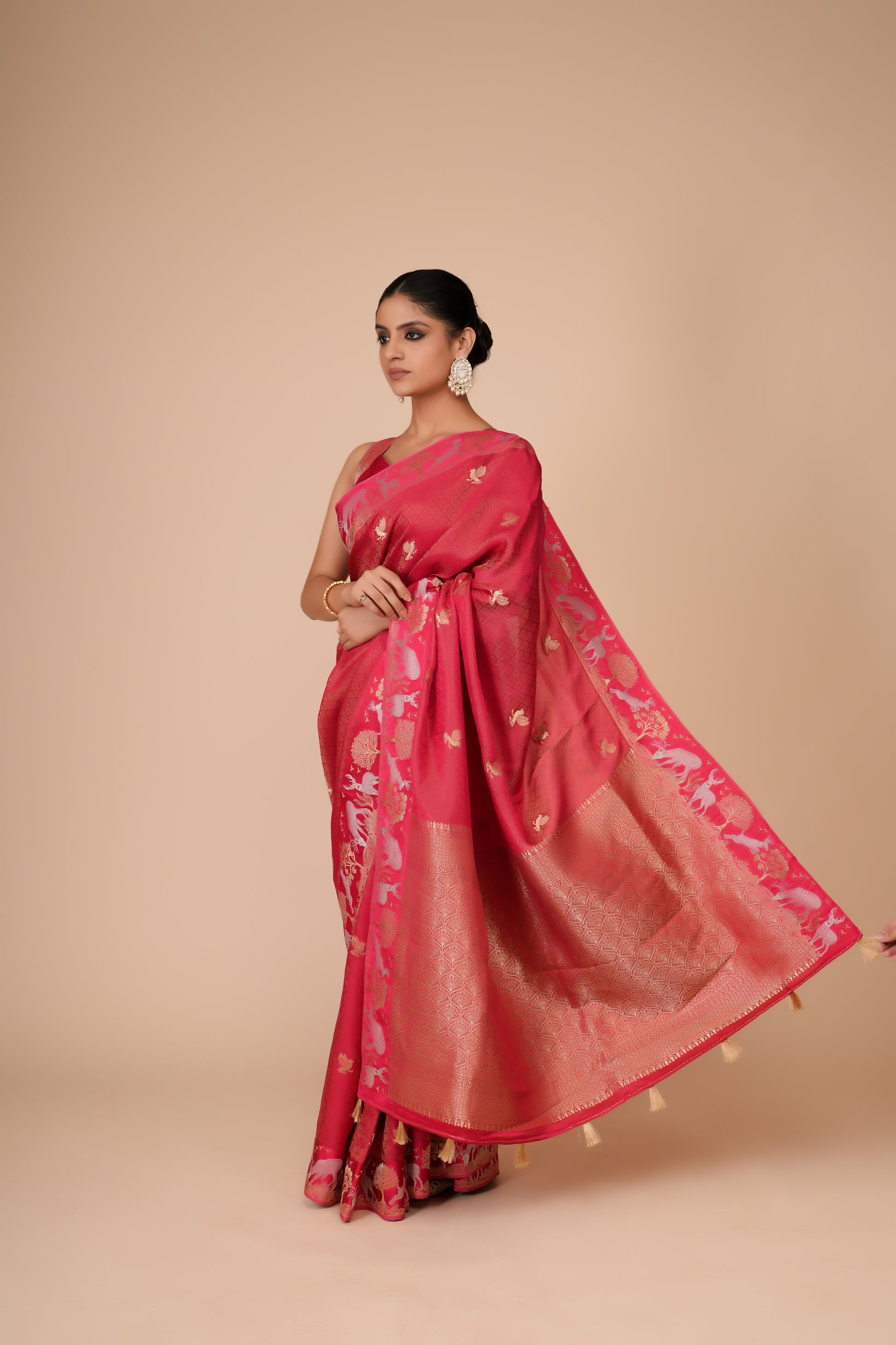 Featuring this elegant pink saree in dola silk fabric from Indrani store. This saree has beautiful golden bird motifs all over with heavy detailing in the border. The pallu of this saree has heavy weaving with tassel detailing. the saree comes with a matching silk blouse material making it an ideal choice for your festivities.