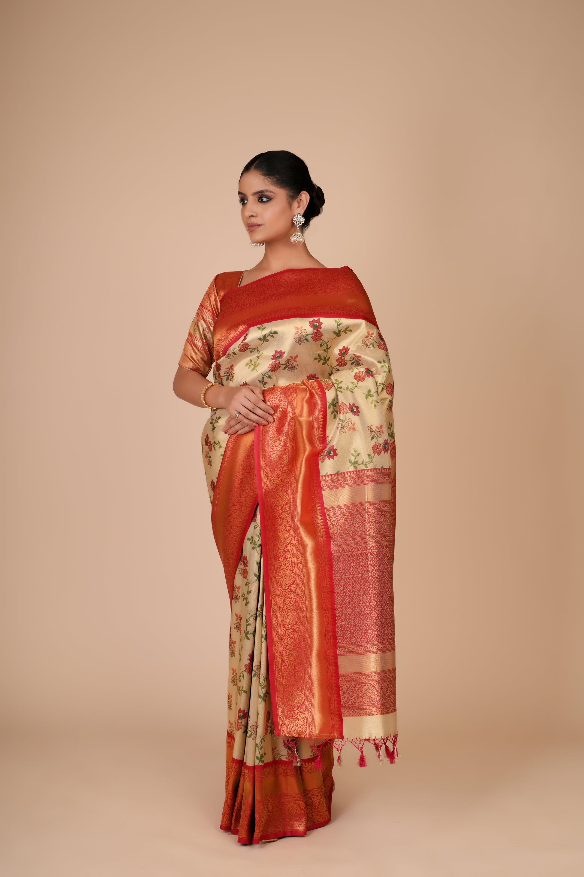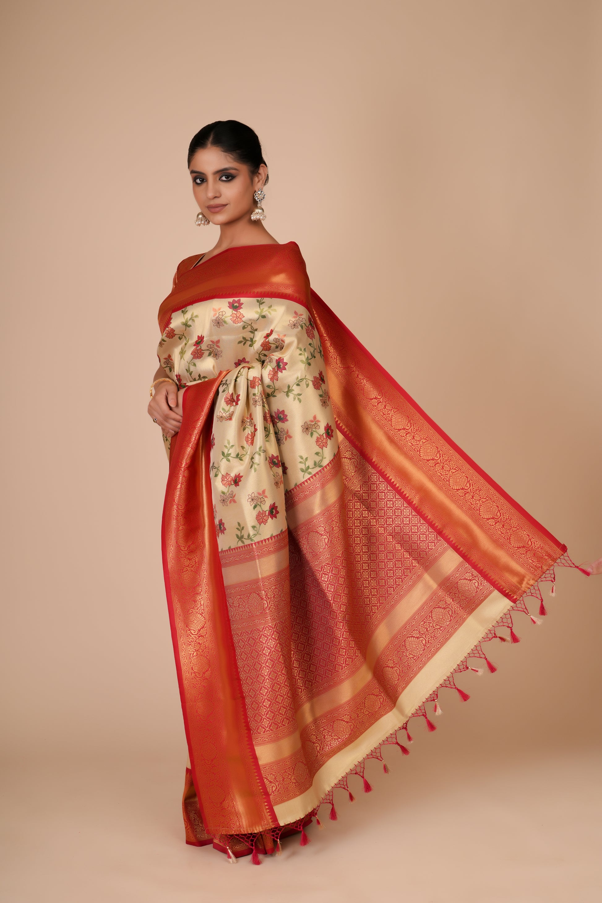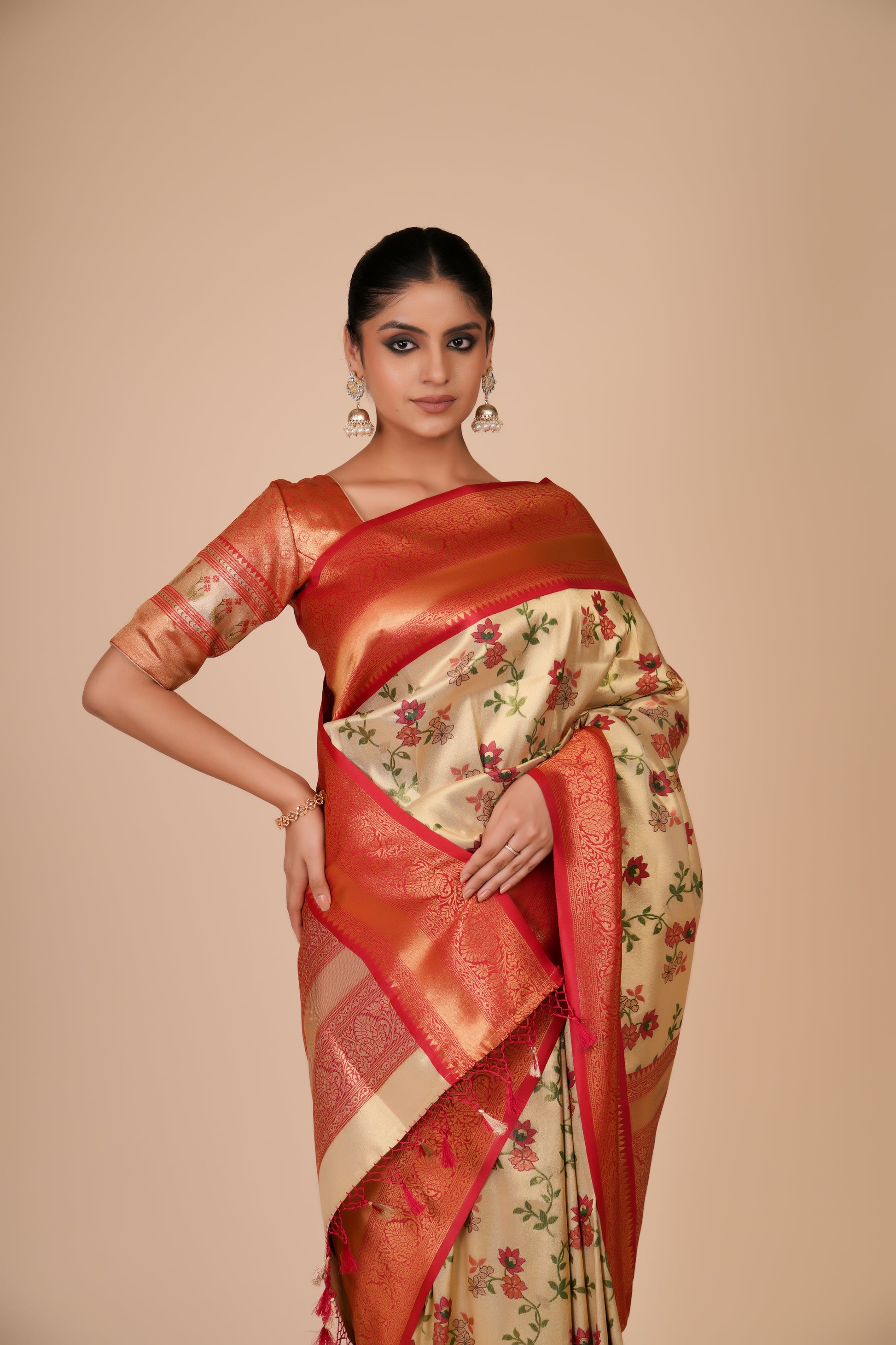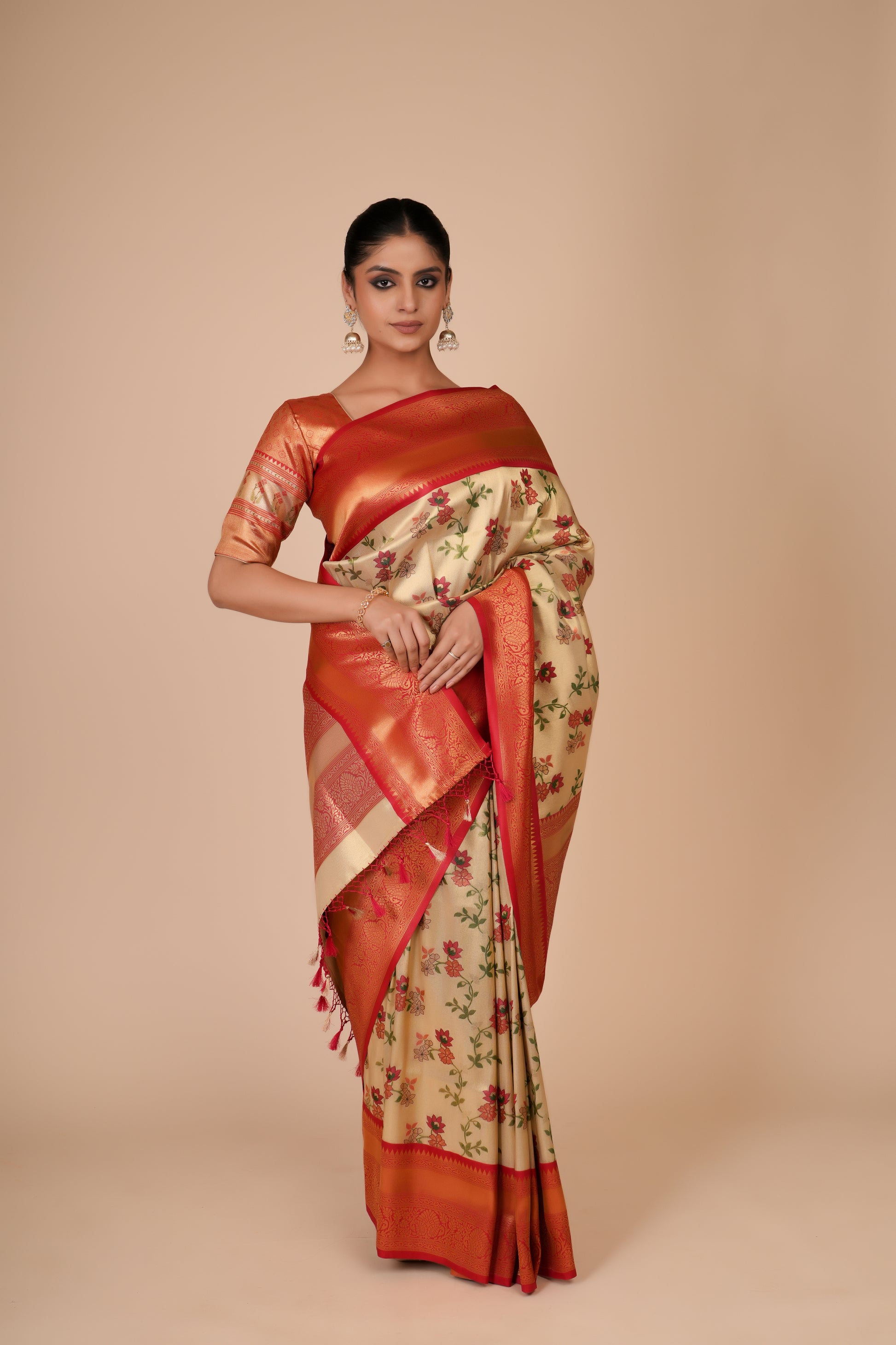 Featuring this elegant gold & red saree in tissue silk fabric from Indrani store. This saree has floral pattern all over with heavy border. The saree comes with matching blouse making it an ideal choice for you festivities.