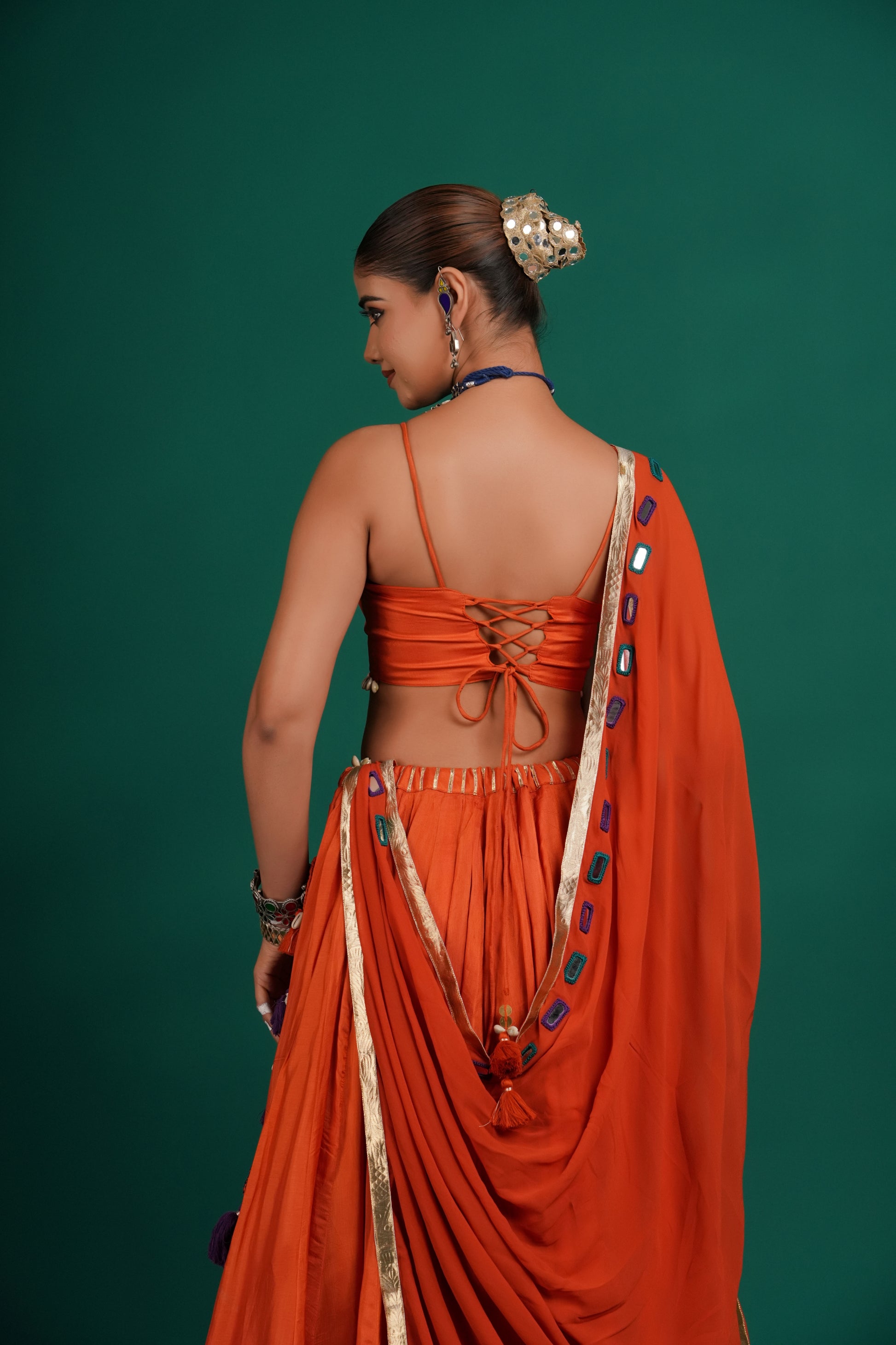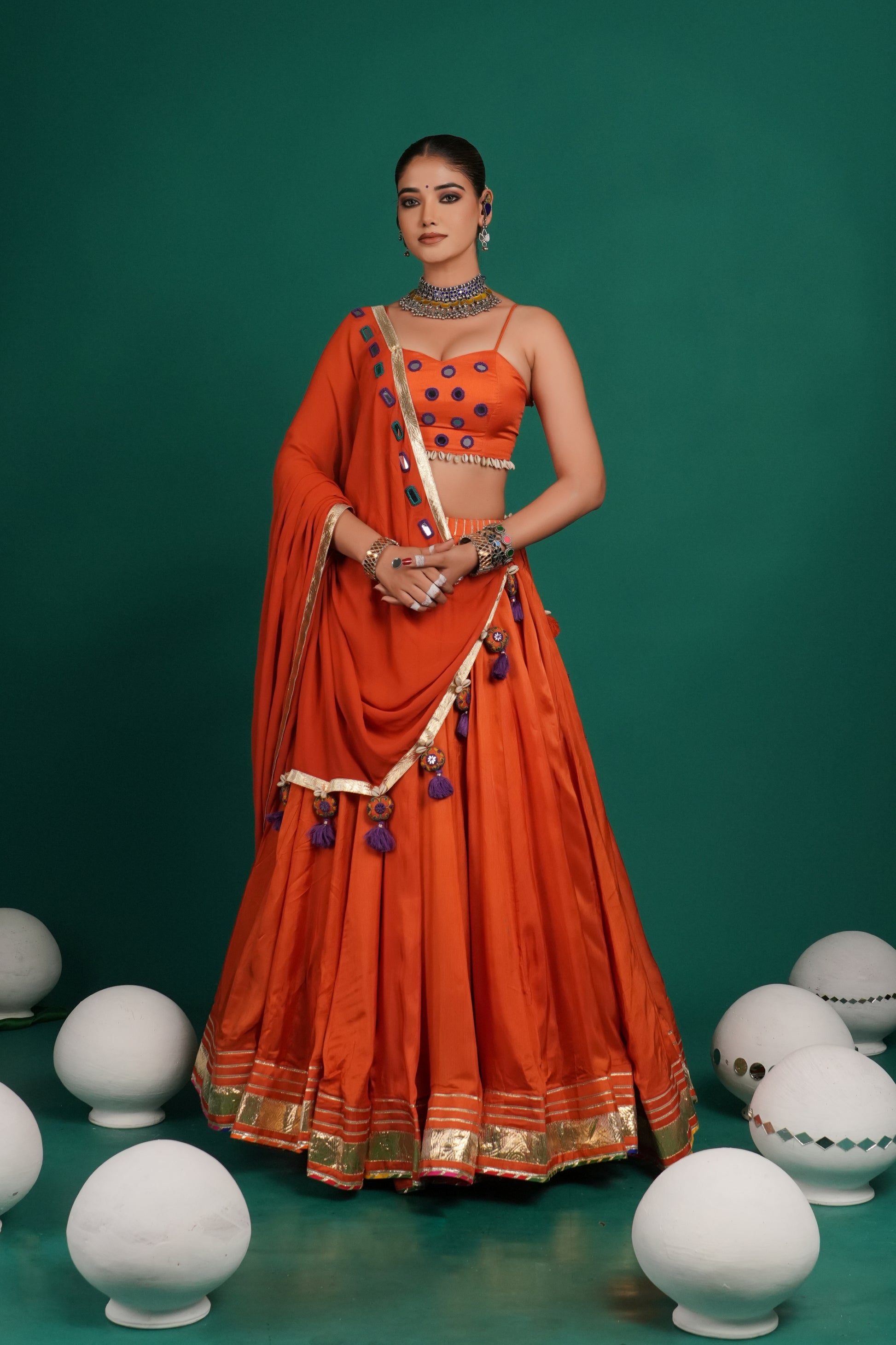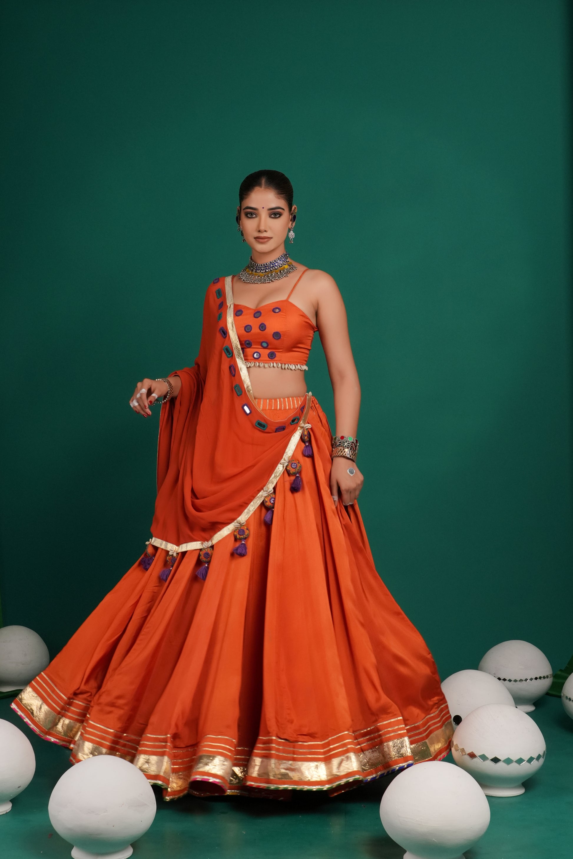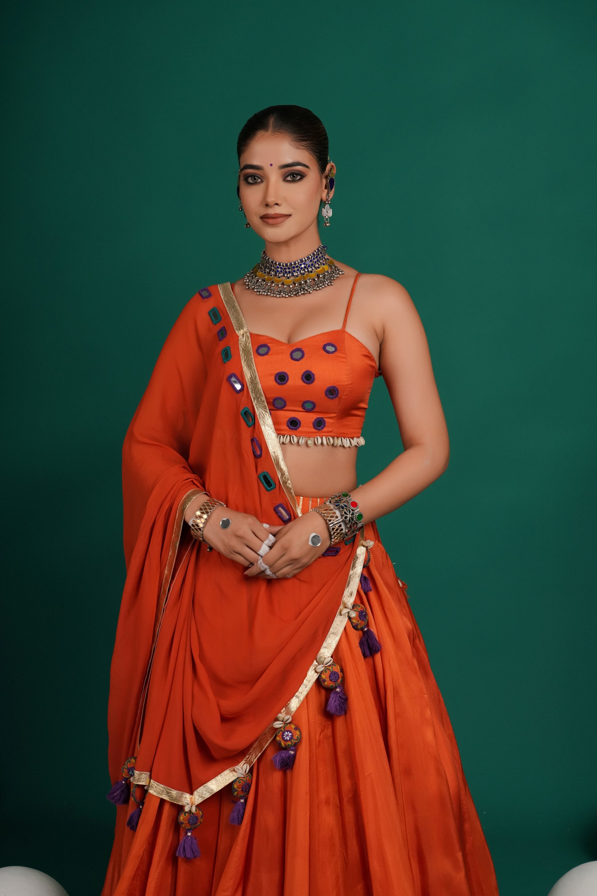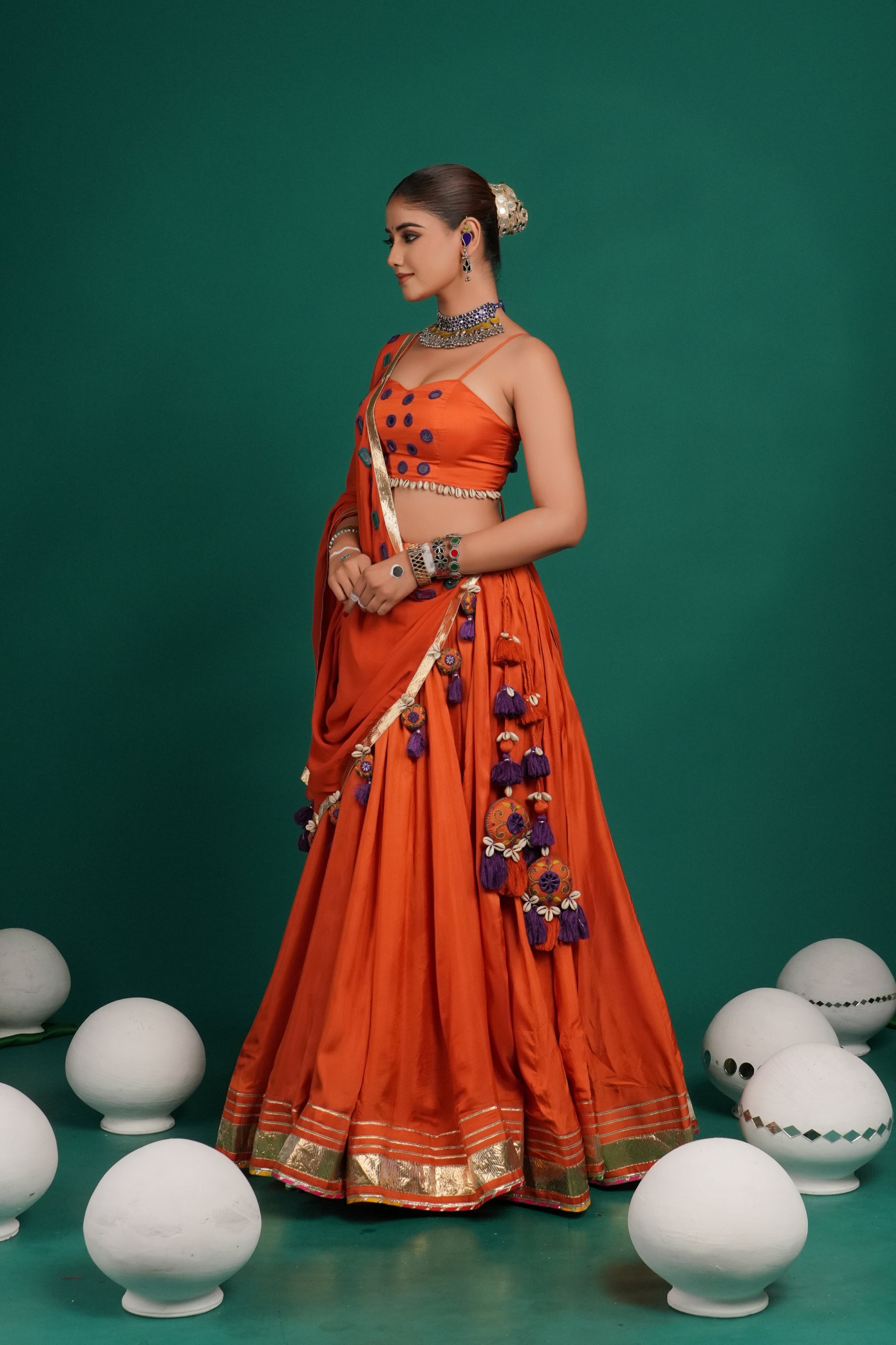 Indulge in this chic orange lehenga in Russian silk fabric from Indrani store. The lehenga has beautiful lampi skirt border all over with tassel detailing. The lehenga is paired with matching blouse and embroidered dupatta. The lehenga’s 15-meter flare creates a breathtaking silhouette—elegant, graceful, and truly captivating, whether you're swirling to the beats of Garba or revelling in the festive fervour.