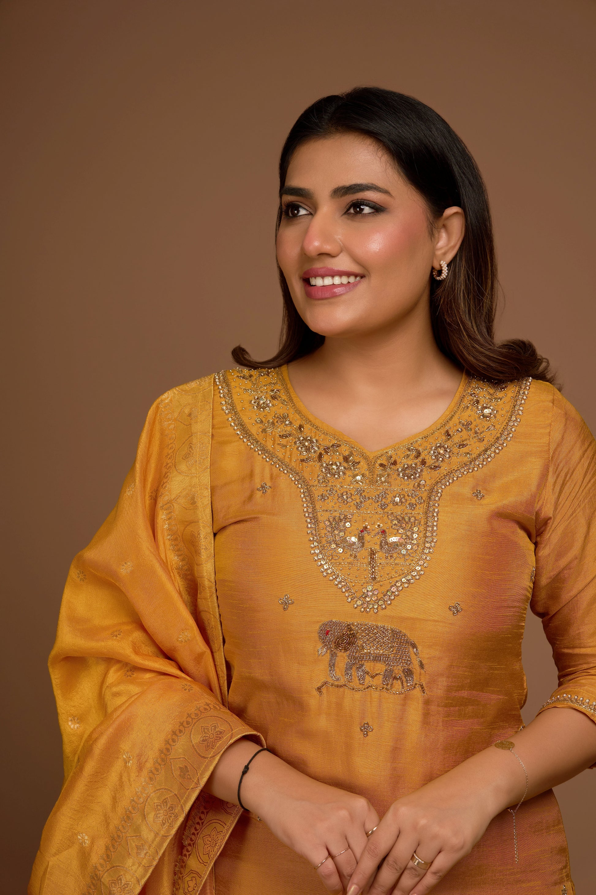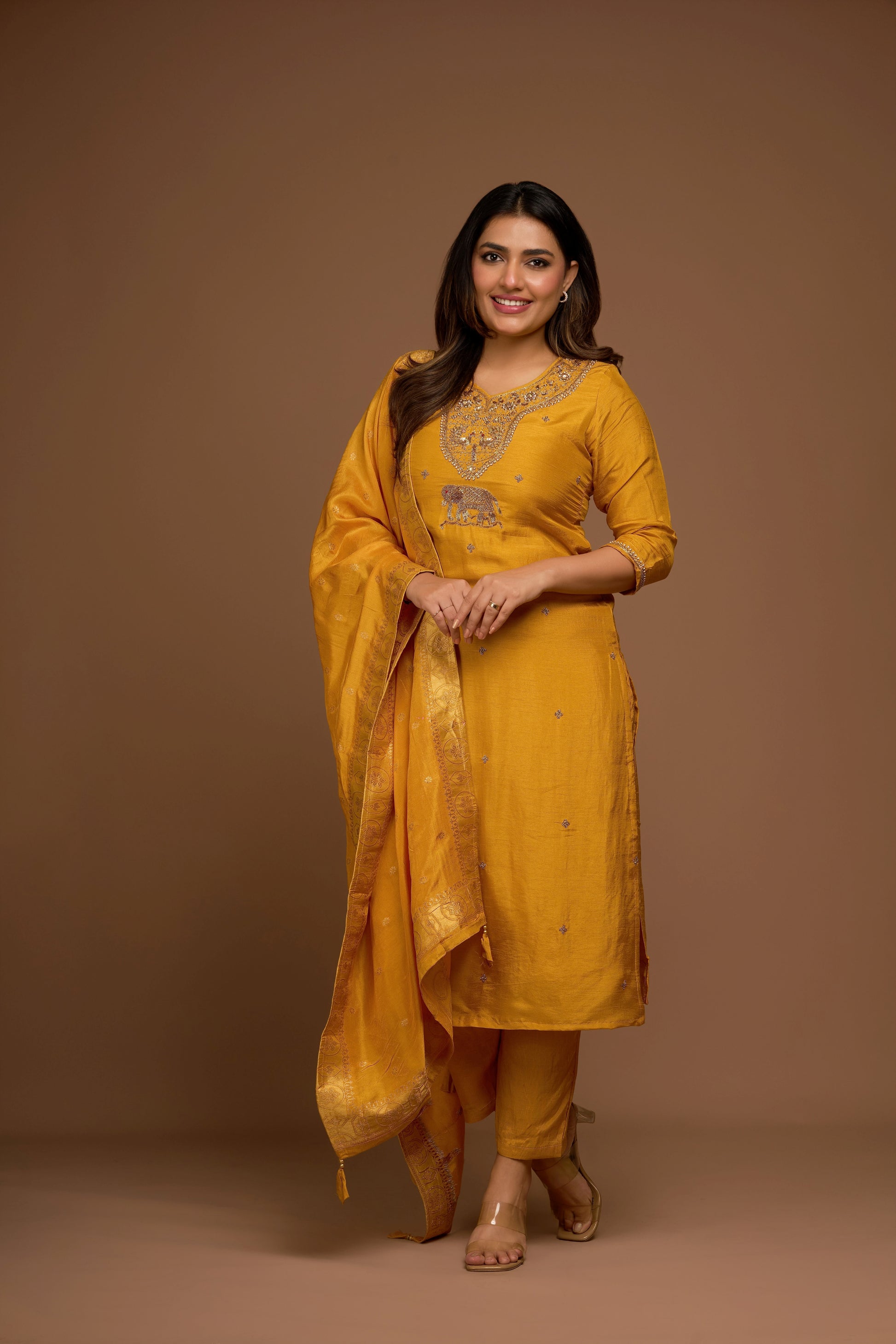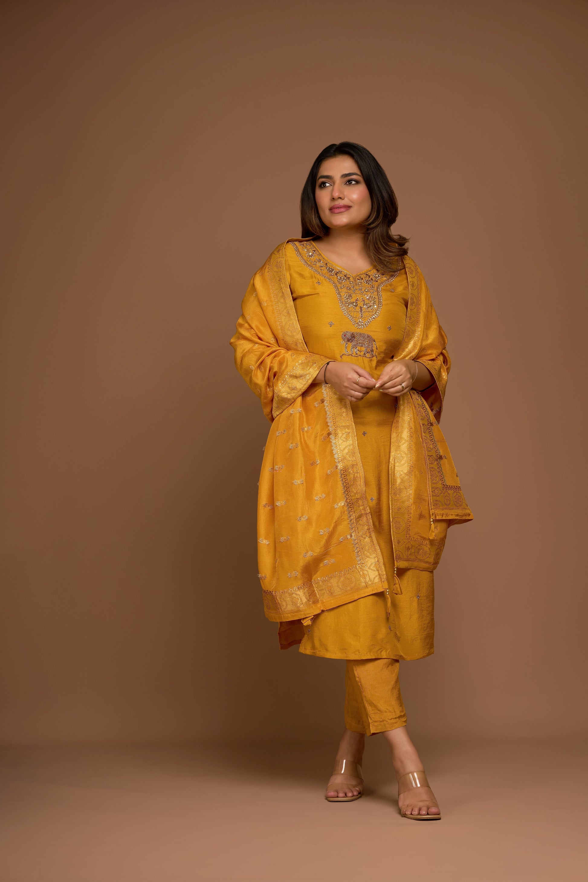 Elevate your wardrobe with this chic yet subtle dola silk turmeric orange kurta set from Indrani store. This ensemble has zardosi and sequins work on the kurta along with matching pants. It comes with a matching dupatta with border and tassels detailing on it.