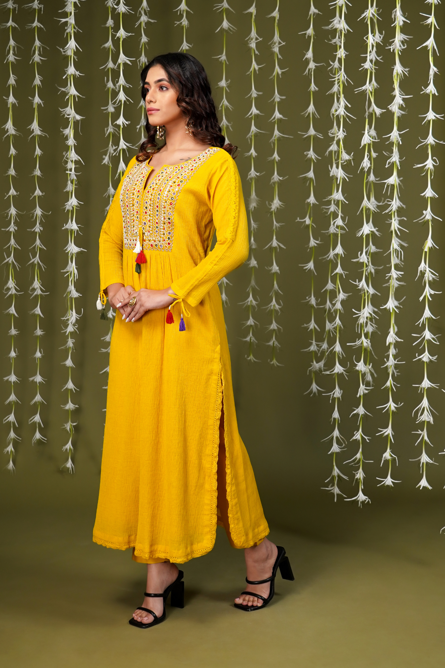Introducing this radiant yellow embroidered suit set from Indrani store. It is made with premium crushed mal mal fabric. It showcases intricate embroidery of pearls in the neck. It comes with a matching chiffon dupatta.