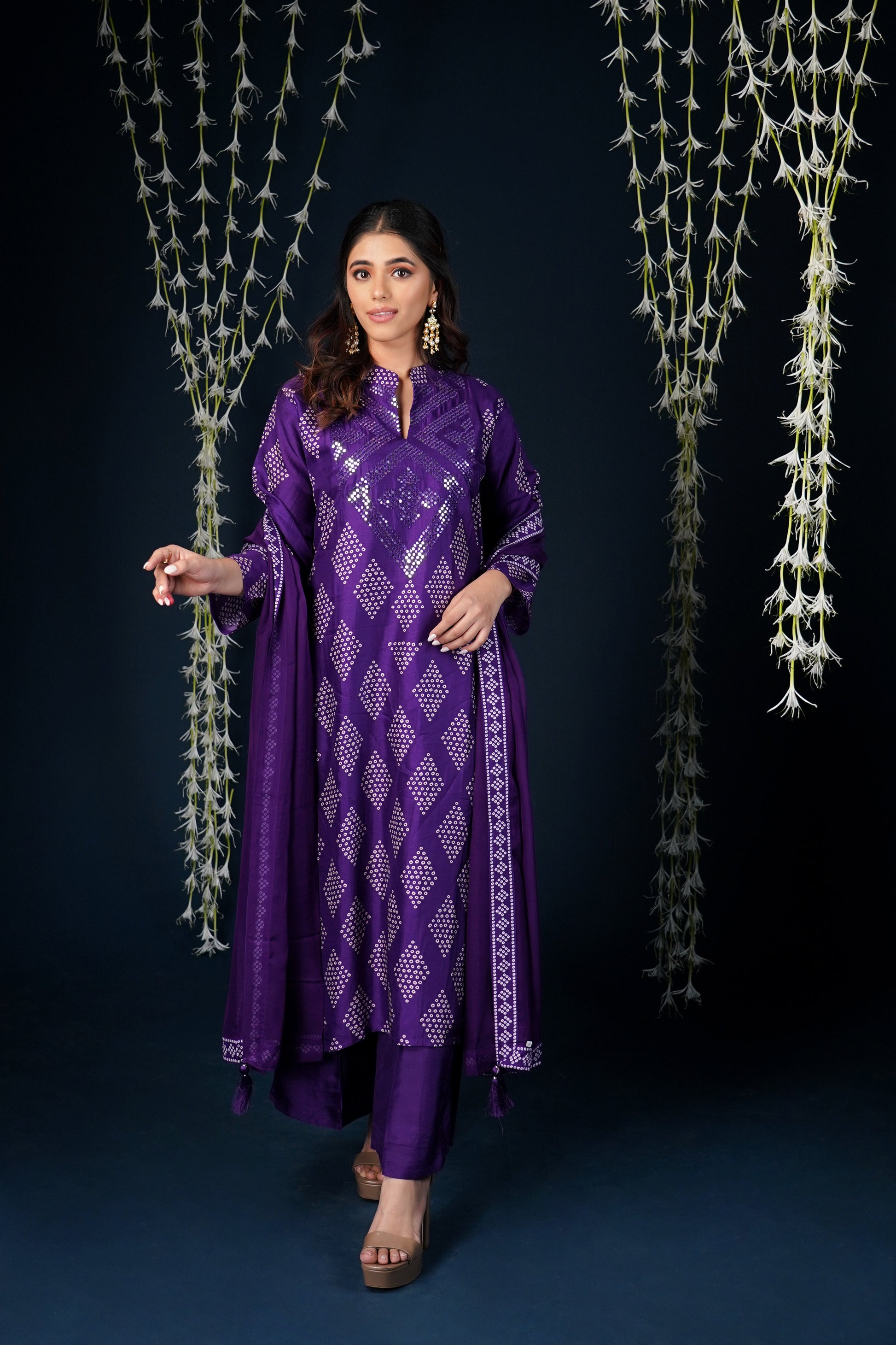Introducing this elegant bandhej suit in violet shade from Indrani store. It is fabricated in silk material with organza dupatta. It adorned with mirror embroidery and bandhej print all over.