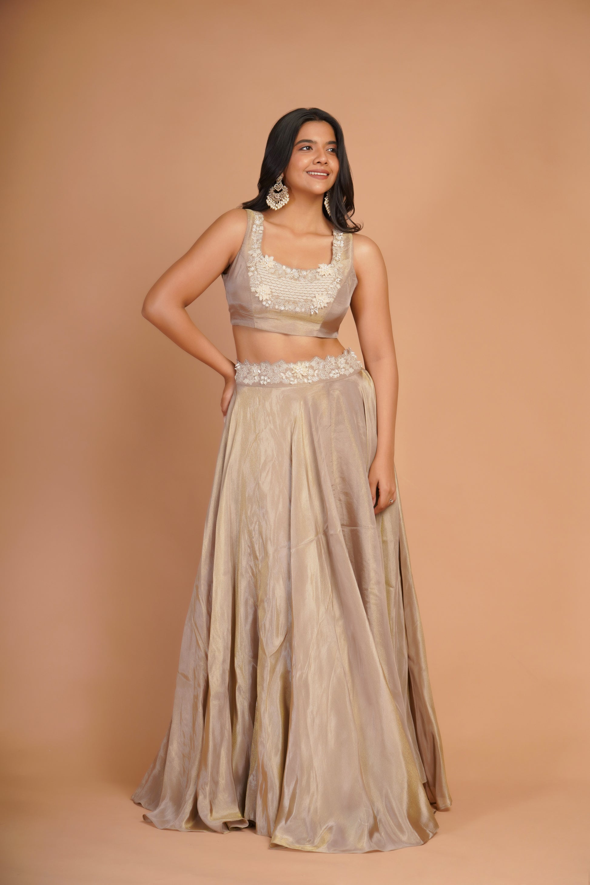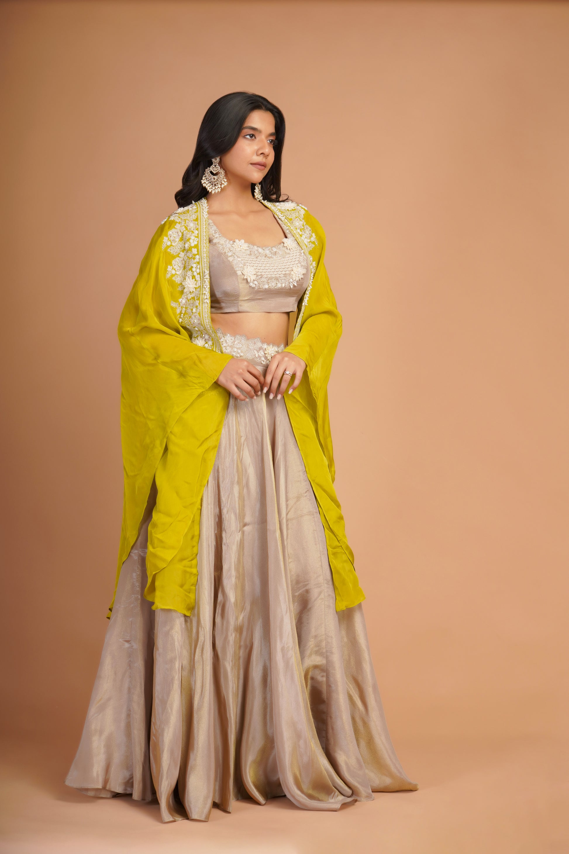 Featuring this gorgeous warm grey Indo-western set in tissue fabric from Indrani store. The ensemble has embroidered blouse with matching skirt. The beautiful detailing in cape is a perfect way to add glamour to your festive celebrations.